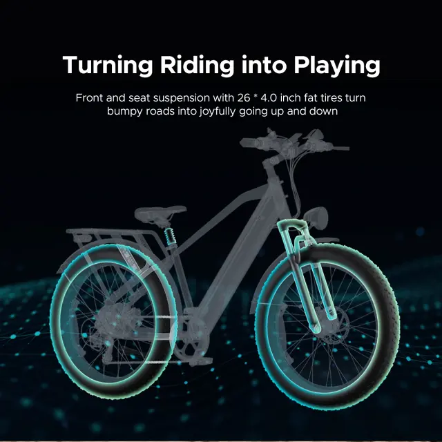 To električno kolo za odrasle ima sistem dvojnega vzmetenja, vključno s sprednjimi blažilniki in sedežem za blaženje udarcev. Vozniki lahko prilagodijo prednapetost prednjega vzmetenja svojim željam, možnost zaklepanja pa zagotavlja prilagodljivost za različne pogoje vožnje. To zagotavlja udobno in nadzorovano vožnjo po grobih in neravnih površinah.