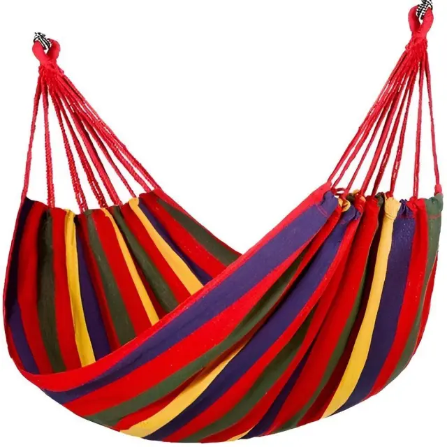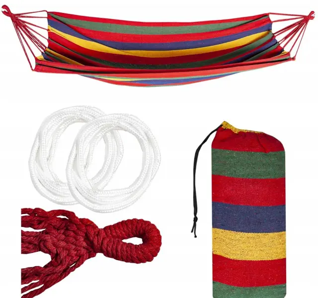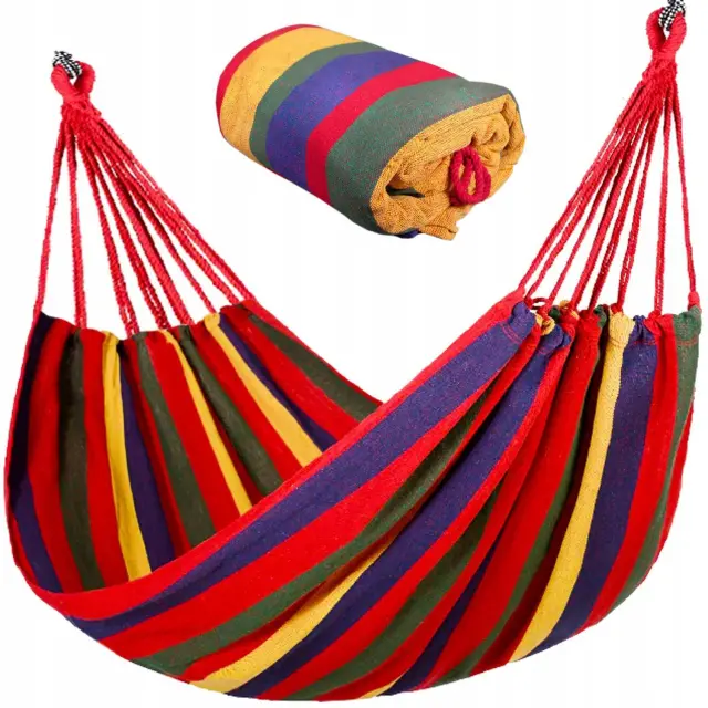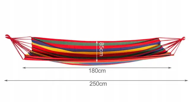 SPECIFIKACIJA – barva: večbarvna; material: bombaž, plastika; maks. obremenitev: 120 kg; mere materiala (dolžina / širina): 180 / 85cm; mere viseče mreže (dolžina/širina): 250/85cm; teža: 0,80 kg