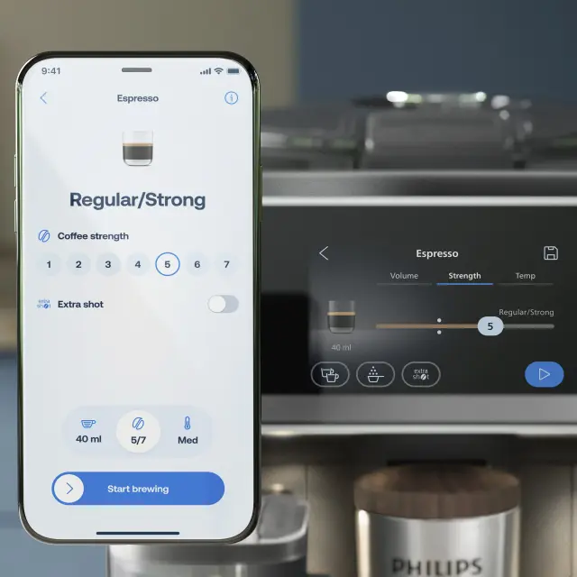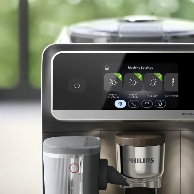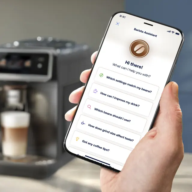 Prilagodite nastavitve aparata, pripravite kavo na daljavo ali raziskujte nasvete in recepte prek aplikacije HomeID. Z Barista pomočnikom odkrijte skodelico kave, ki ustreza vašemu okusu. Uporabljate ga lahko neposredno na aparatu ali prek aplikacije HomeID. Klepetajte z njim in mu povejte, katera kavna zrna uporabljate, da samodejno prilagodi nastavitve priprave, s katerimi izvleče najboljši okus.