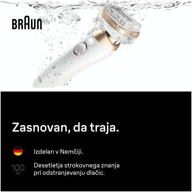 Predstavljamo Braun Silk-épil 9-9 – vrhunsko rešitev za dolgotrajno gladko kožo brez dlačic. Dosezite kakovost rezultatov, kot bi bili v salonu, iz udobja svojega doma. Doživite svilnato gladko kožo na enostaven način s popolnoma gibljivo glavo, celo na težavnih območjih, kot so kolena in pazduhe. Prilagaja se vašim konturam, da je odstranjevanje dlačic povsem preprosto. Ta brezvrvični aparat za odstranjevanje dlačic s 40 pincetami MicroGrip ujame celo najtanjše dlačice (0,5 mm), zato se lahko poslovite od čakanja, da dlačice ponovno zrastejo. Njegova široka glava pokrije veliko območje za kožo brez dlačic v nekaj potezah. Epilator lahko uporabljate v kopalni kadi ali pod prho, da zmanjšate občutek bolečine. Njegov natančni ročaj poskrbi za popoln oprijem tudi med mokro uporabo. Pozdravite gladko kožo brez potrebe po obiskih salona ali čiščenja nereda. Zasnovani, da vzdržijo vrsto let: naši epilatorji so izdelani v Nemčiji.