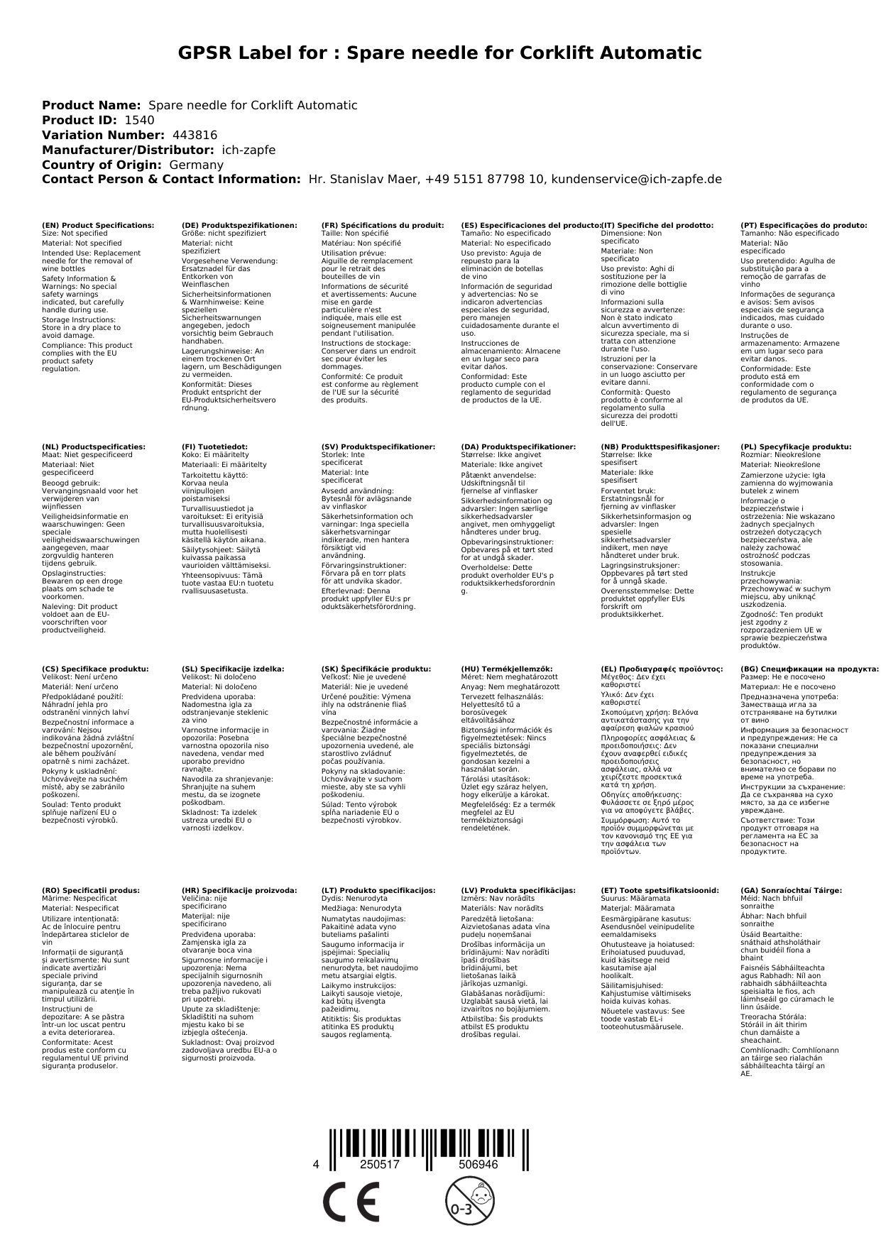 Z ersatznadelom za Corklift Automatik dvignete raven vašega vinsko-odpiralnega doživetja. Ne dovolite, da vas slaba oprema pokvari užitek – izberite kakovost in enostavnost. Naročite zdaj in spremenite način, kako odpirate svoje najljubše vino!