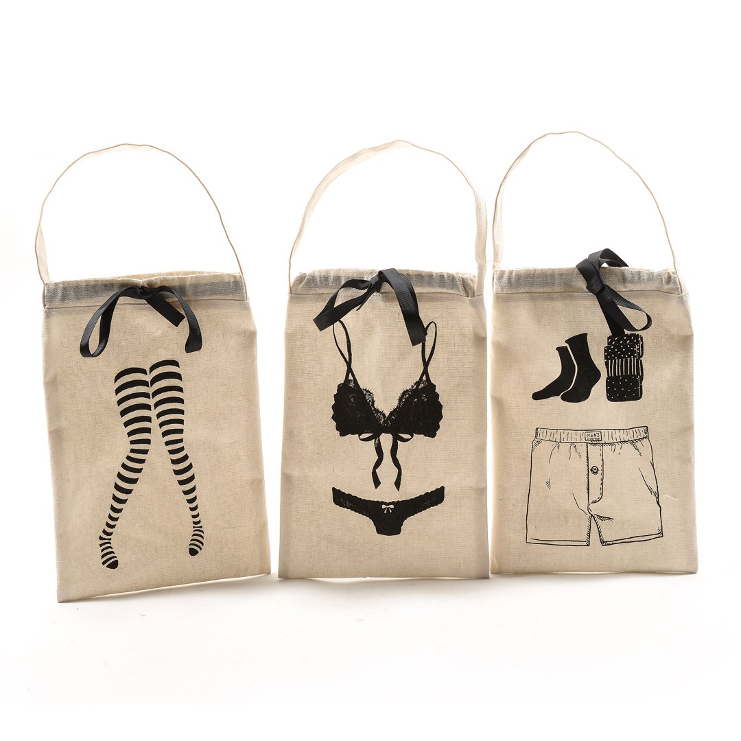 Vreča za spodnje perilo iz linije ESSENTIALS dimenzij 30 x 20 cm je idealna za shranjevanje vašega spodnjega perila in nogavic. Vrečo s perilom lahko postavite v predalnik, lahko visi v vaši kopalnici in z njo poskrbite, da je perilo diskretno pospravljeno, nepogrešljiva pa je predvsem na potovanjih, saj je na ta način vaš kovček pregledno urejen. Trpežna bombažna vrečka je na notranji strani prevlečena z nepremočljivo plastjo poliestra, ima priročen ročaj, je trendovskega črno-belega designa, na izbiro pa so ženski in moški motivi. SESTAVA: 70% poliester, 30% bombaž