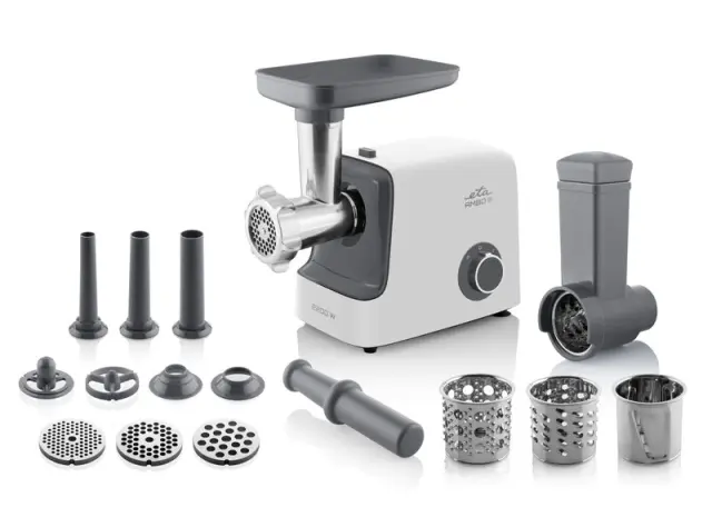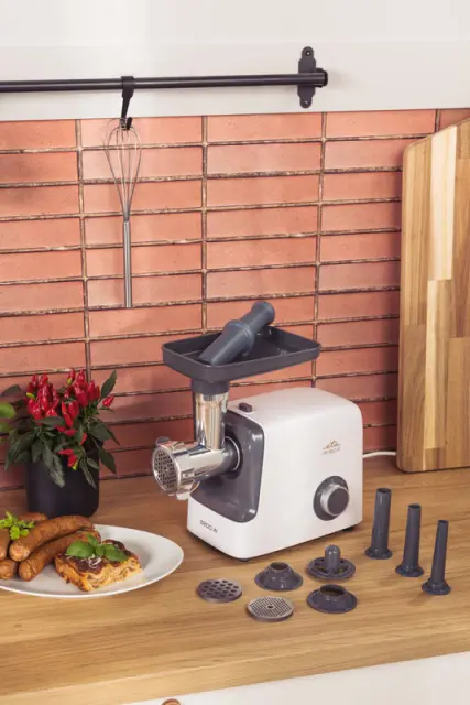 - Dodatki: 3x plošce za fino, srednje in grobo mletje (Ř 8, 5 in 3 mm), 3x nastavki za izdelavo klobas (klobase, klobase, klobase) premera 14/18/22 mm, Nastavek za izdelavo Kebbe, Nastavek za ribanje, 4x bobnasti strgalniki iz nerjavecega jekla (strigalnik za rezanje, fino in grobo ribanje ter trganje)