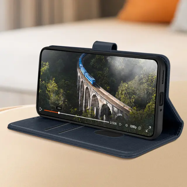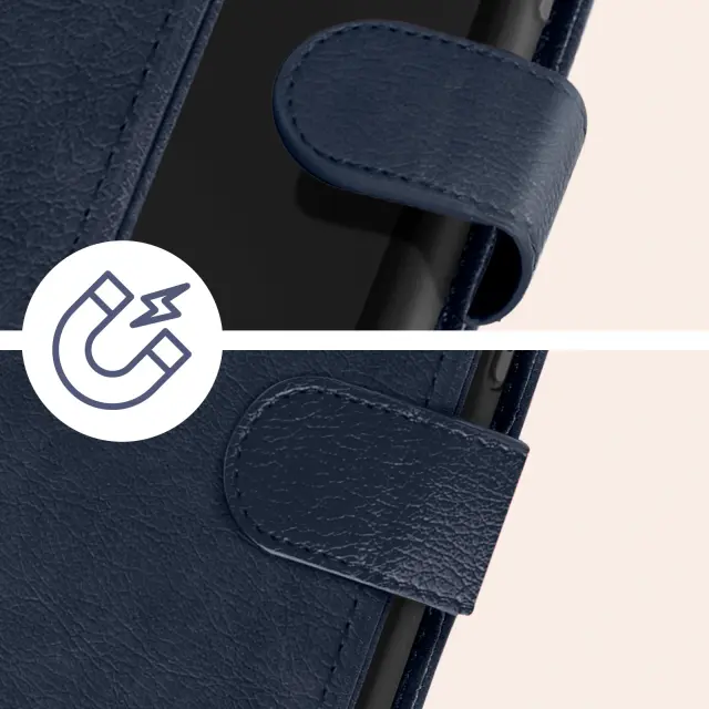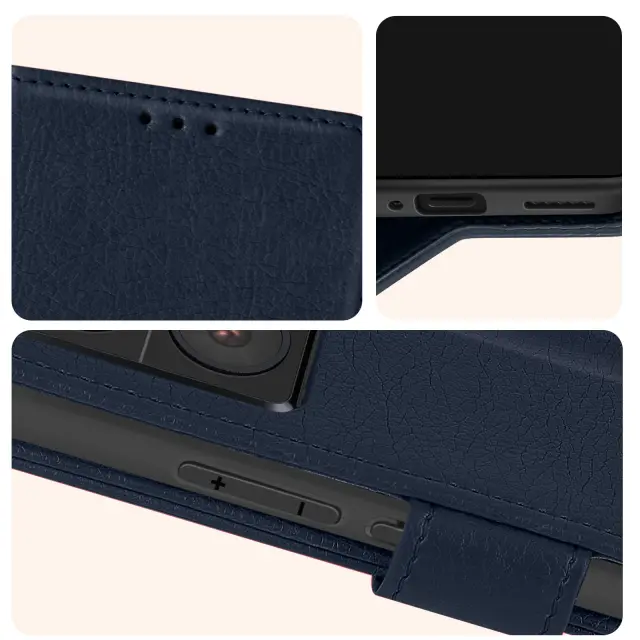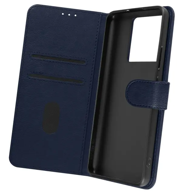 Xiaomi 13T in 13T Pro etui serije Chesterfield polnocno modra. Ta prevleka ima denarnico, vgrajeno v podlogo zavihka. Služi tudi kot video podpora. Integriran je magnetni jezicek.