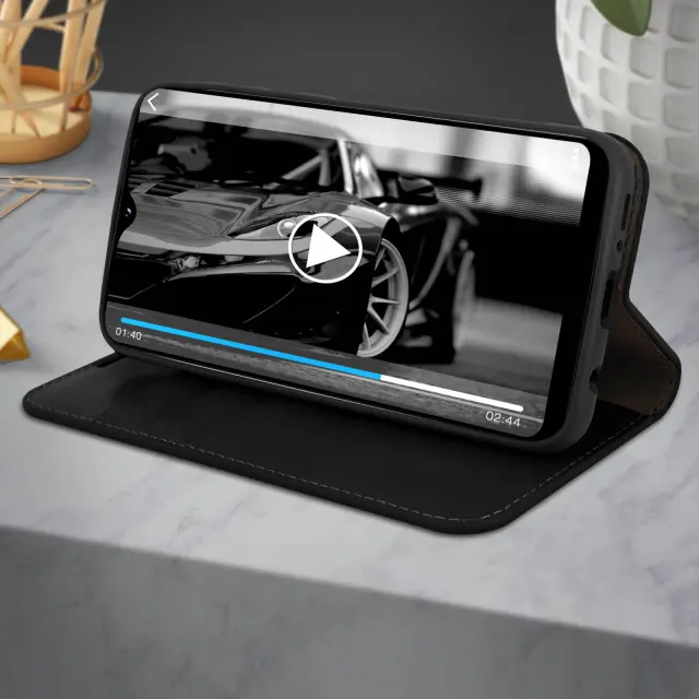 Etui, držalo za kartice in stojalo za video iz pravega usnja - crna str. Samsung Galaxy A20e
