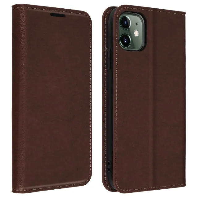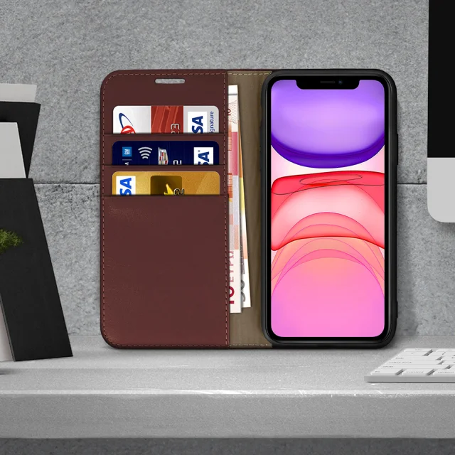 Folio etui za iPhone 11. Prevleka iz pravega usnja s šivanim zaključkom. Po meri oblikovana, prilagodljiva in odporna podporna prevleka iz silikonskega gela. Reže za držalo za kartice in stranski žep v notranji oblogi pokrova.
