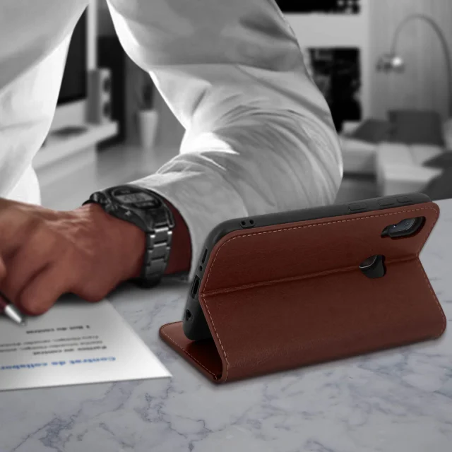 Etui, držalo za kartice in stojalo za video iz pravega usnja - temno rjava str. Samsung Galaxy A20e