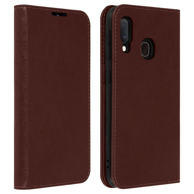 Folio etui za Samsung Galaxy A20e. Prevleka iz pravega usnja s šivanim zaključkom. Po meri oblikovana, prilagodljiva in odporna podporna prevleka iz silikonskega gela. Reže za držalo za kartice in stranski žep v notranji oblogi pokrova.