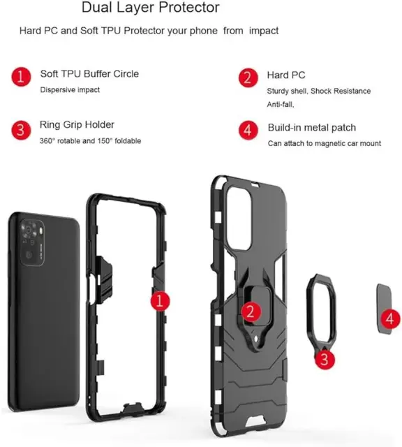 Pokrov je sestavljen iz dveh med seboj povezanih delov. Hrbtna plošča iz PC materiala je trda in skrbi za stabilnost celotnega pokrova. Prilagodljiv TPU okvir pokriva stranice telefona, absorbira energijo udarca in ščiti zaslon in kamero tako, da štrli čez rob naprave.