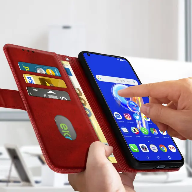 Etui za Asus Zenfone 9, denarnica in stojalo, žepi za kartice in trak za denar - rdec