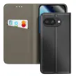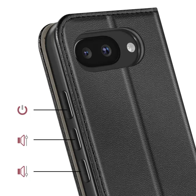 To ohišje za Google Pixel 10a ima črno imitacijo usnja z rahlo zrnatim učinkom.. Teksturirana zunanjost iz umetnega usnja zmanjšuje vidne sledi in izboljšuje oprijem v roki.. Mehka silikonska notranja lupina absorbira udarce na vogalih in omogoča lažje vstavljanje telefona. Zložljiv zavihek zagotavlja stabilno oporo za ogled vsebine v ležečem načinu.