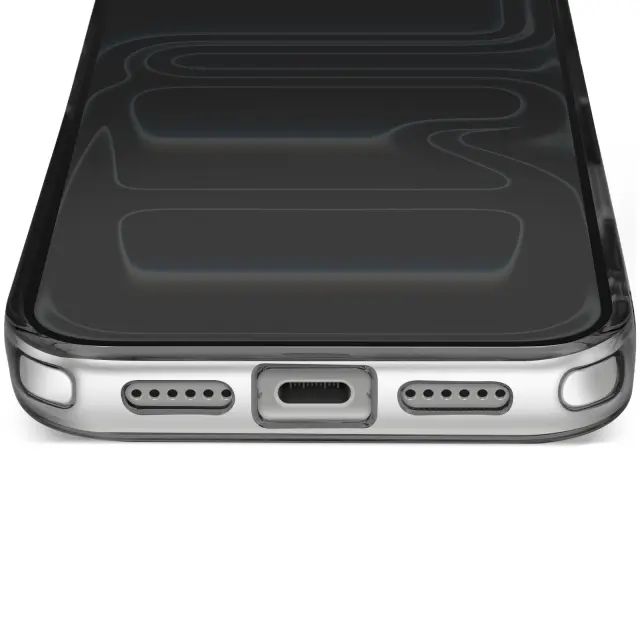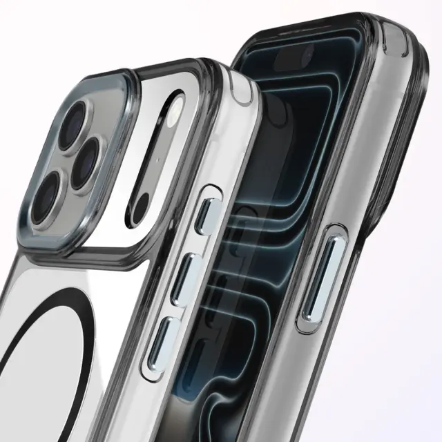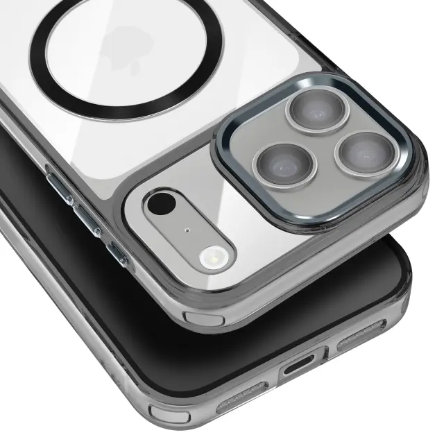 Hibridna struktura s togim hrbtiščem in mehkimi robovi, odpornimi na udarce. Združljiv s sistemom MagSafe za hitro polnjenje in stabilno magnetno pritrditev. Obdelava proti rumenenju za dolgotrajno prozornost. Dvignjen okvir kamere in gumbi s kovinskim učinkom.
