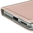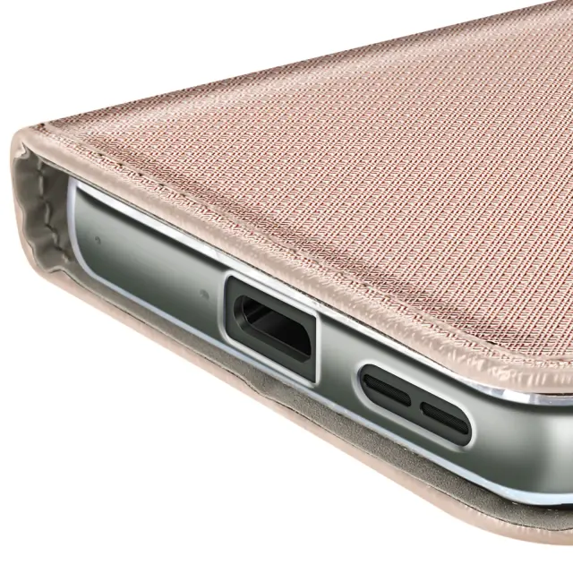 Funkcija denarnice z namenskim prostorom za bančno ali poslovno kartico. Prevleka iz teksturiranega usnja za elegantno zaščito in odličen vsakodnevni oprijem. Mehka silikonska notranja lupina absorbira udarce, gumbi in priključki pa so prosto dostopni.. Vgrajeno stojalo za prostoročno gledanje videoposnetkov ali opravljanje klicev.