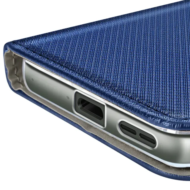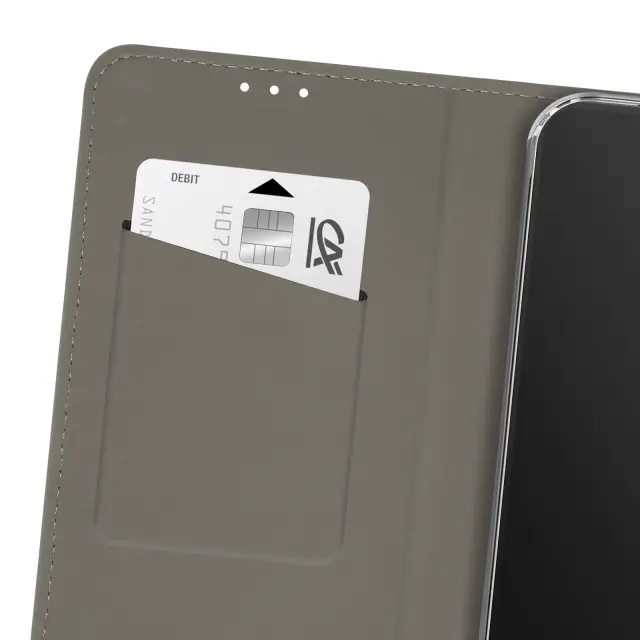 Funkcija denarnice z namenskim prostorom za bančno ali poslovno kartico. Prevleka iz teksturiranega usnja za elegantno zaščito in odličen vsakodnevni oprijem. Mehka silikonska notranja lupina absorbira udarce, gumbi in priključki pa so prosto dostopni.. Vgrajeno stojalo za prostoročno gledanje videoposnetkov ali opravljanje klicev.