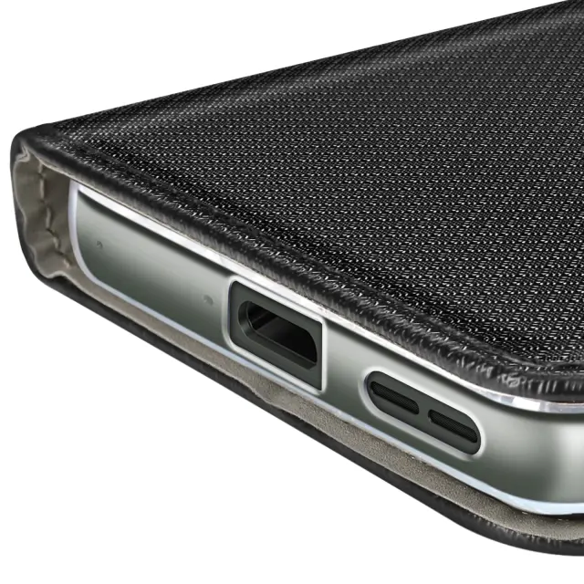 Funkcija denarnice z namenskim prostorom za bančno ali poslovno kartico. Prevleka iz teksturiranega usnja za elegantno zaščito in odličen vsakodnevni oprijem. Mehka silikonska notranja lupina absorbira udarce, gumbi in priključki pa so prosto dostopni.. Vgrajeno stojalo za prostoročno gledanje videoposnetkov ali opravljanje klicev.