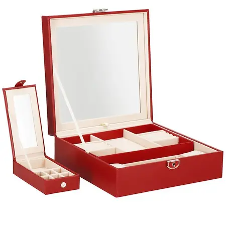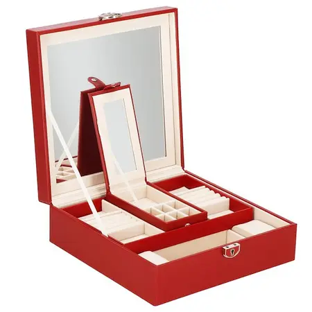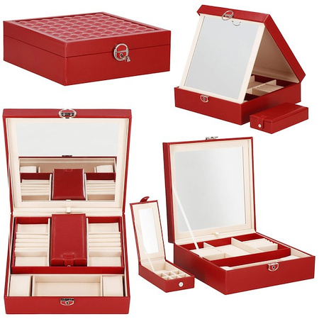 Škatla za nakit vam bo omogočila udobno in varno shranjevanje različnih vrst prstanov, verižic, zapestnic, brošk in drugih dodatkov. V našem predstavljenem primeru bo vsak dodatek dobil svoje mesto. Zahvaljujoč temu ne boste nikoli izgubili drugega uhana v paru in verižice se ne bodo zapletle. Etui znamke Springos vsebuje številne predalčke, v katere lahko organizirate svoje dragocenosti. Poleg tega smo na notranjo stran pokrova namestili ogledalo. Srebrni elementi se odlično ujemajo z bordo škatlo za nakit. Organizator je majhen, zato je idealen za potovanja. Doma je priporočljivo, da ga postavite na toaletno mizo ali komodo.