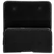 Ovitek s sponkami za pas za pametni telefon velikosti SL. Ovitek z zrnatim učinkom s šivi na vrhu. Dvojne zaponke: zanka za pas in sponka. Magnetno zapiranje.