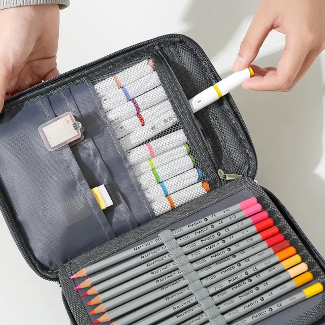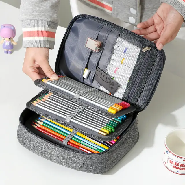 Velika prostornina: Ta svinčnik ima prostorno notranjost, ki vsebuje veliko različnih pisalnih potrebščin, kot so pisala, radirke, trakovi in celo majhni dokumenti. Njegova večplastna zasnova zagotavlja učinkovito organizacijo in ohranja vaše zaloge lepo organizirane in lahko dostopne.