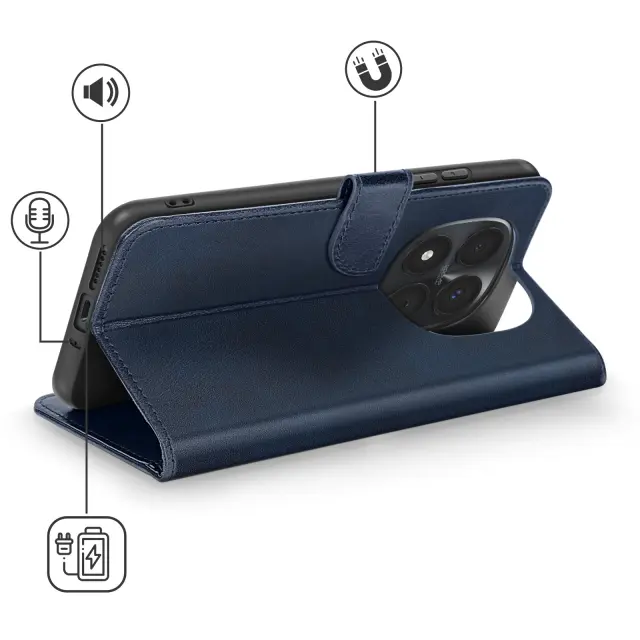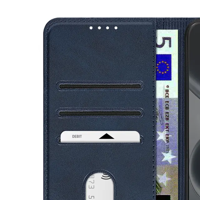 To polnočno modro ohišje ščiti vaš telefon Redmi Note 15 Pro 5G s prilagodljivo notranjo lupino TPU, ki učinkovito absorbira udarce.. Površina z videzom zrnatega usnja je mehka na otip, vendar odporna na vsakodnevno obrabo.. Kovček ima tri reže za shranjevanje različnih kartic, značk ali vstopnic.. V stranskem žepu lahko shranite denar ali nekaj računov..