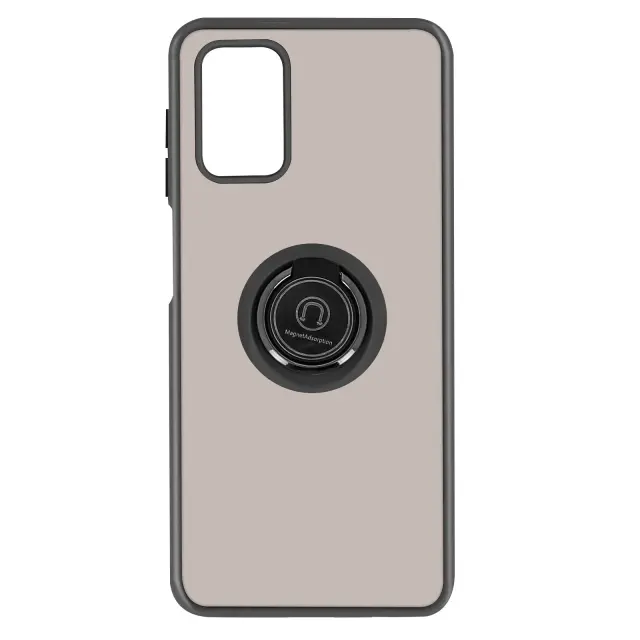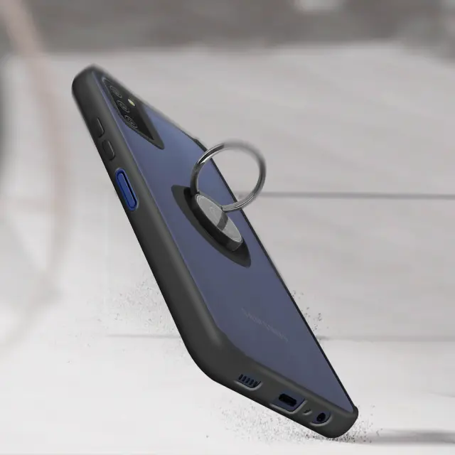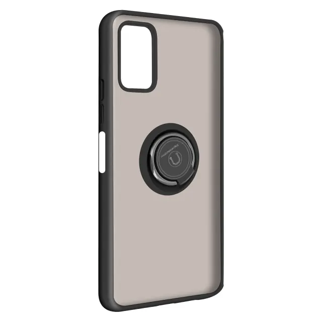 Crno polikarbonatno ohišje Samsung Galaxy A03S. Njegov prozoren in dimljen videz ter mat robovi dajejo moderen videz. Gumbi so odstranljivi in zamenljivi. Opremljen je z zadrževalnim obrocem, ki deluje tudi kot opora za video.