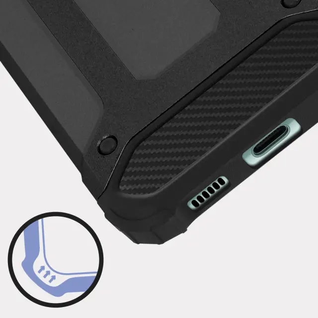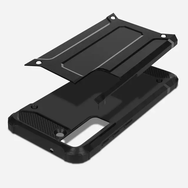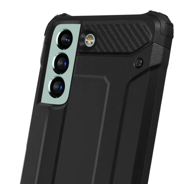 Crn ovitek za Samsung Galaxy S21 FE, odporen na udarce, iz serije Defender II. Vaš pametni telefon šciti pred padci z višine do 1 m80 in ima ojacane vogale za vecjo zašcito vašega mobilnega telefona. Funkcije mobilnega telefona ostajajo dostopne.