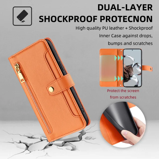 Eleganten in praktičen: Ta etui za telefon združuje modo in funkcionalnost z živahno oranžno barvo in praktično zasnovo denarnice. V njem lahko nosite telefon, kartice in gotovino.