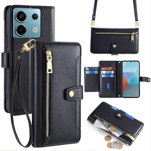 Vsestransko in funkcionalno: Z več režami za kartice in predalom za gotovino lahko priročno nosite svoje najnujnejše stvari. Snemljiv pašček za zapestje in nastavljiv naramni trak nudita vsestranske možnosti nošenja.