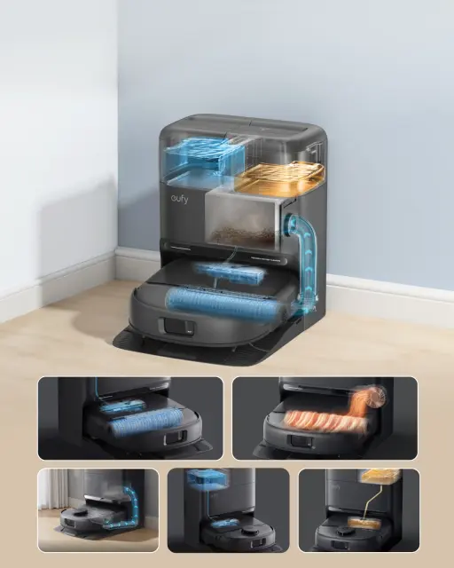 5-v-1 Omni postaja za prostoročno uporabo: Poenostavite svojo rutino z avtomatskim praznjenjem prahu, pranjem valjčnega mopa, polnjenjem vode, sušenjem z vročim zrakom in zbiranjem odpadne vode.