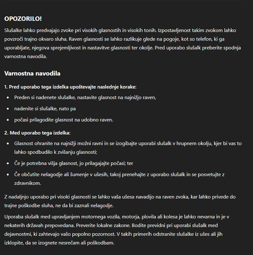 Glasnost ohranite na najnižji možni ravni in se izogibajte uporabi slušalk v hrupnem okolju, kjer bi vas to lahko spodbudilo k zvišanju glasnosti;