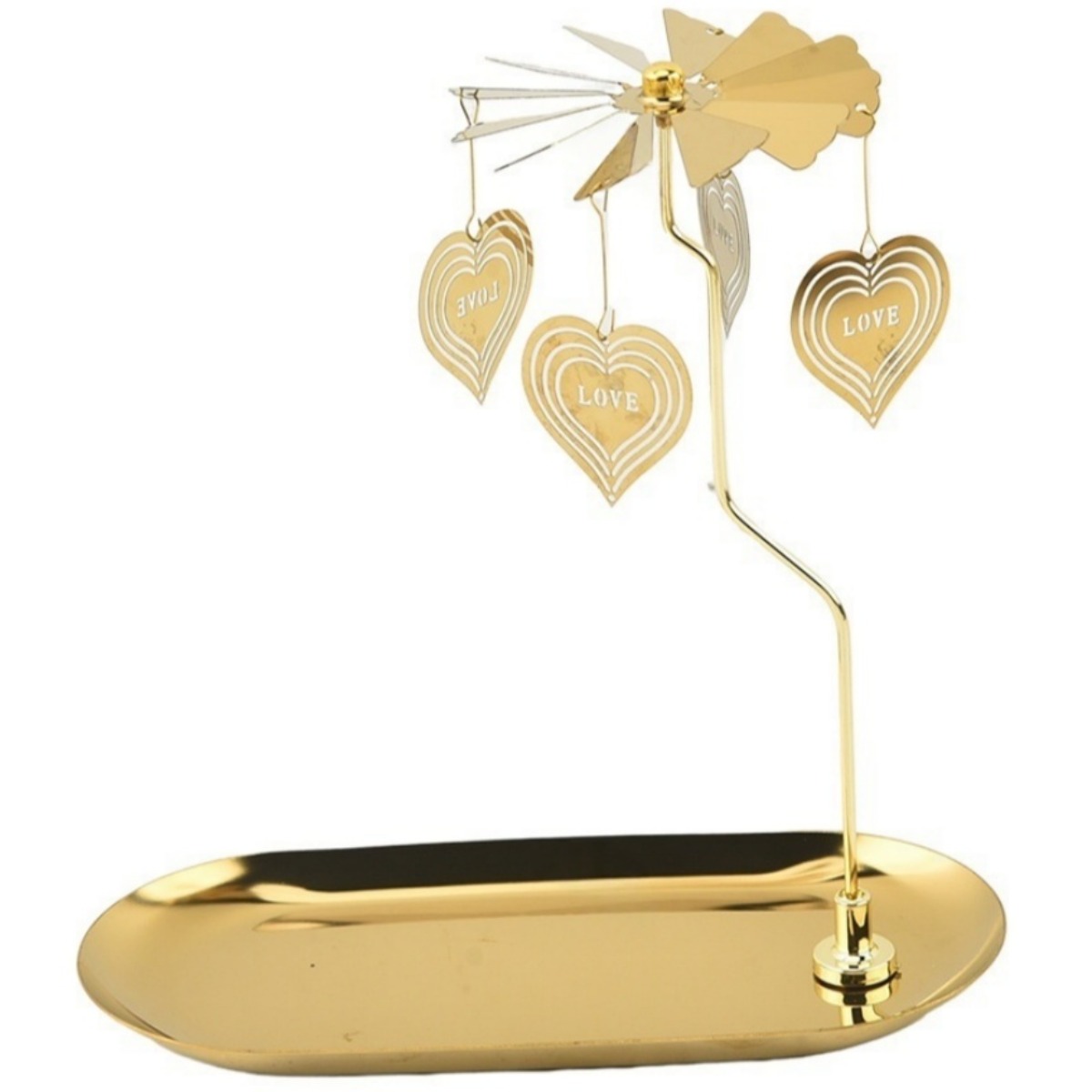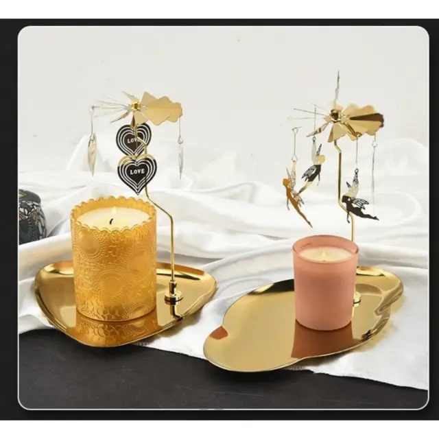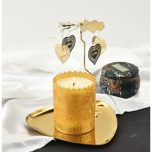 Ustvarjalec romantične atmosfere: Ta evropski stil zlati kovinski vrtljivi svečnik je zasnovan za ustvarjanje romantične in prijetne atmosfere. Ko se toplota sveče dvigne, se vrtiljak nežno vrti in oddaja očarljiv prikaz svetlobe in senc ter izboljšuje ambient vsakega prostora. Popoln za romantične večerje, poroke, zabave ali preprosto dodajanje elegance vašemu domu. Njegovi srčasti okraski dodajo dodatno plast ljubezni in topline.