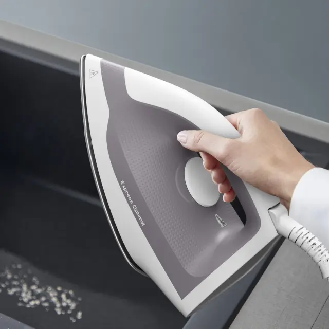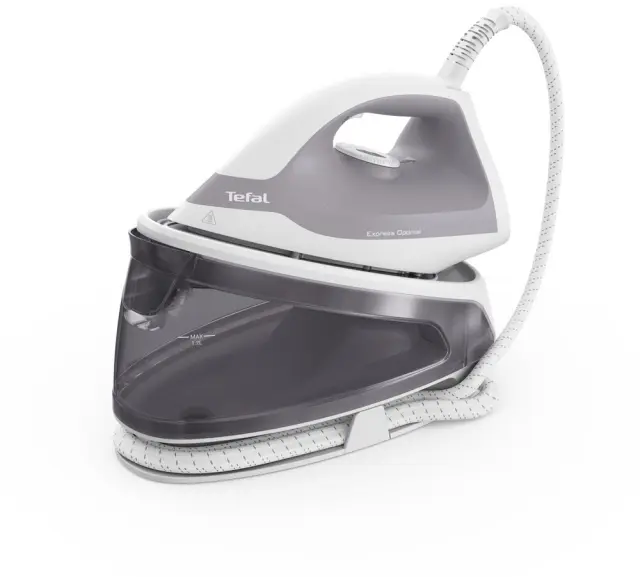 Tefal Express Optimal parni likalnik, močna para, črpalka s 5,3 bari, udar pare 200 g/min, izjemno kompakten okvir, tehnologija Calc Clear, 1,2-litrska posoda za vodo, likalna plošča Xpress Glide, SV4111E0