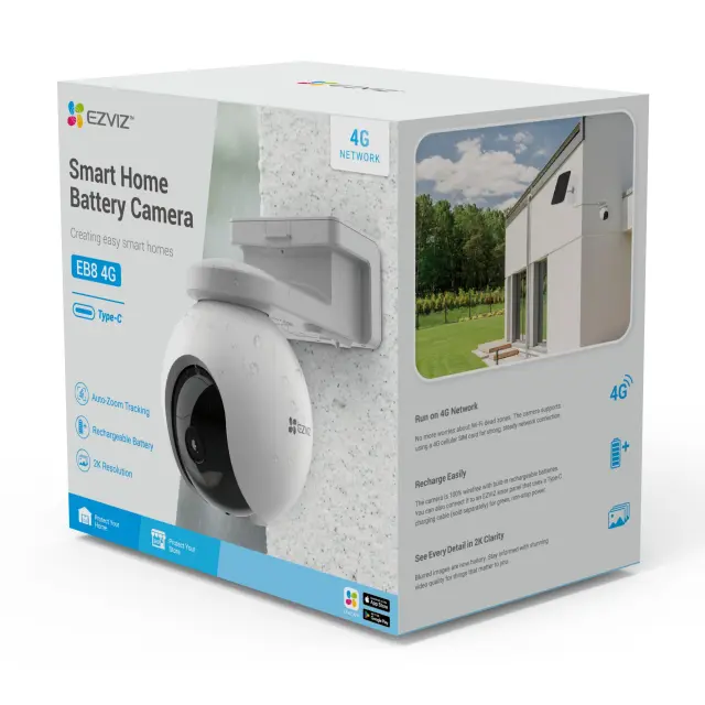 Z EZVIZ 4G nadzorno kamero vzpostavite varnost na mestih, ki so vam najbolj pomembna. Najnovejša kamera EZVIZ premaga omejitve namestitve, ki jih povzročajo omrežja ali elektrika. EB8 4G se napaja iz baterije brez priključenih kablov. Deluje v omrežjih 4G LTE na prostem, kjer Wi-Fi morda ni na voljo. Prav tako ponuja funkcije za premikanje in nagibanje kamere in priklop na EZVIZ solarni panel, da zagotovi pametno in zanesljivo zaščito 24/7.
