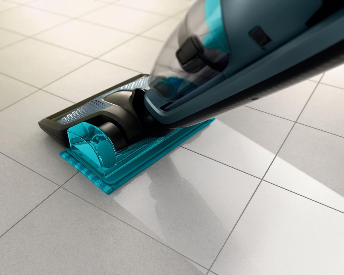 Edinstven sistem za pomivanje upravlja sprostitev vode za optimalno vlažnost med čiščenjem vseh vrst trdih tal. Krpe iz mikrovlaken* lahko operete ročno ali v pralnem stroju.