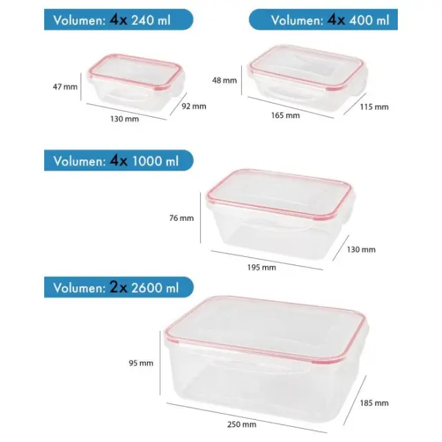 - Prostornina: 2x 2600 ml + 4x 1000 ml + 4x 400 ml + 4x 240 ml