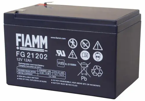 <p>Namen uporabe : Splošna uporaba; UPS sistemi, Alarmni sistemi, Telefonska oprema, Zasilne luči, ...<br /> <br /> OPIS :<br /> Vsi akumulatorji FIAMM so svinčeno kislinski akumulatorji z ventili za regulacijo (valve regulated lead acid - VRLA). Za te vrste akumulatorjev je značilno, da gre kisik, ki nastane kot posledica elektrolize vode na koncu polnenja na pozitivni plošči skozi poseben separator na negativno ploščo, kjer tvori svinčevsulfat in vodo, tako da dodajanje vode ni potrebno. Uporabljeni materiali, dovršena oblika in stroga kontrola proizvodnega procesa zagotavljajo visoko razmerje uporabne energije, glede na enoto prostornine in teže. FIAMM akumulatorji delujejo v temperaturnem razponu od -20°C do +50°C-. </p>
