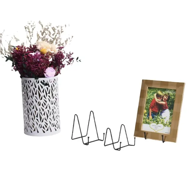 Vsestranska rešitev za razstavljanje: Ta kovinsko stojalo ponuja eleganten in varen način za razstavljanje vaših dragocenih spominov, nagrad ali celo tortic. Njegova fiksna zasnova zagotavlja stabilnost, zaradi česar je popoln za uporabo na mizi. Predstavljajte si, da z eleganco razstavljate svoje najljubše družinske fotografije, predstavljate prestižno nagrado ali predstavljate čudovito izdelano tortico. Minimalistična zasnova stojala dopolnjuje vsak dekor in dodaja pridih prefinjenosti vašemu domu ali pisarni. Idealen je za razstavljanje fotografij, umetnin, krožnikov, nagrad in drugih okrasnih predmetov.