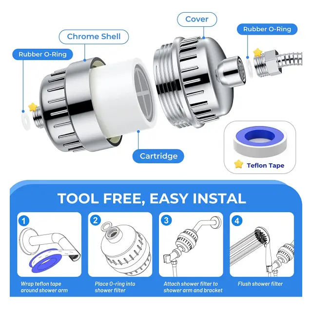 Enostavna namestitev: filter za prho je zasnovan za univerzalno združljivost in ga je mogoče preprosto namestiti na večino standardnih prh brez orodja. Preprosto zavrtite filter med pršno roko in pršno glavo za hitro in enostavno namestitev.
