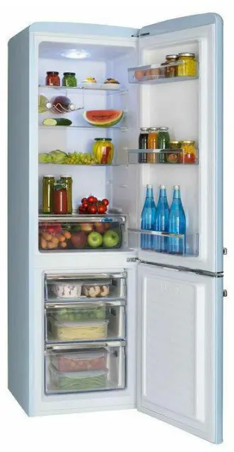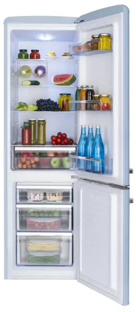 Prostostoječi retro hladilnik Amica FK2965.3LAA vas bo poleg izjemnih lastnosti navdušil s svojo izjemno značilno vintage obliko in barvo. Hladilnik se pohvali s samodejnim odtaljevanjem hladilnega dela, veliko 181 litrsko prostornino hladilnega in 63 litrsko prostornino zamrzovalnega dela. Štiri prostorne police, tri dodatne police na vratih hladilnika ter predal za sadje in zelenjavo v hladilnem delu zadostujejo vsem potrebam velike družine. Prijetna LED osvetlitev in dodaten nosilec za steklenice v notranjosti omogočata izvrsten pregled nad shranjenimi živili. Trije predali v zamrzovalnem delu in 15 urno ohranjanje temperature ob nenačrtovanem izpadu energije zagotavljajo udobno in varno hrambo živil. Atraktivna trendovska retro oblika in izjemno pestra barvna ponudba odražata mladostni pridih nostalgije, ki se elegantno poda v prav vsako kuhinjo.