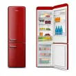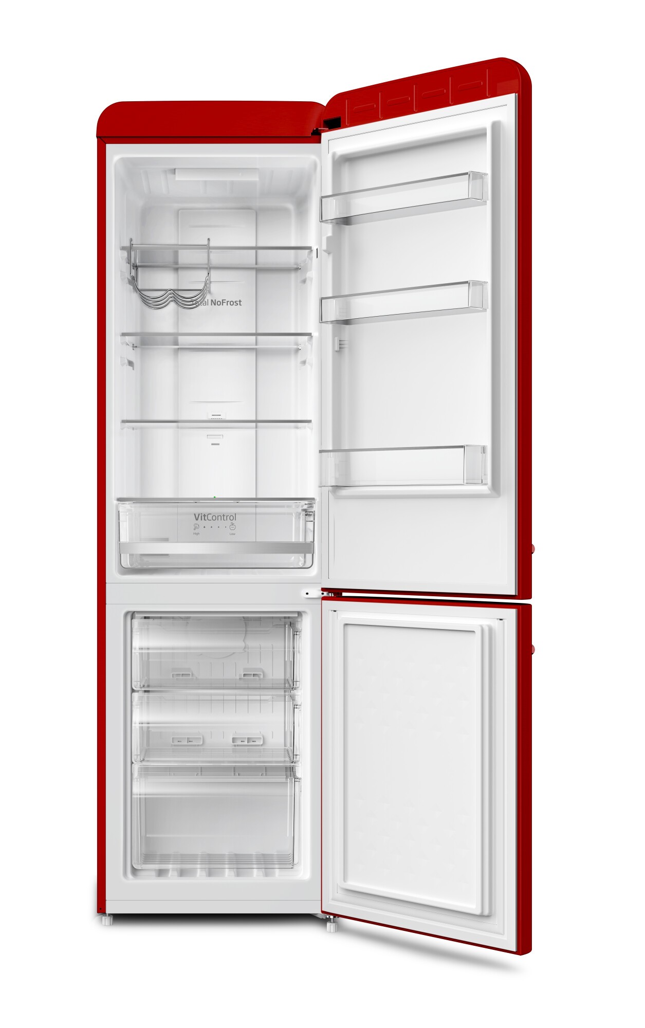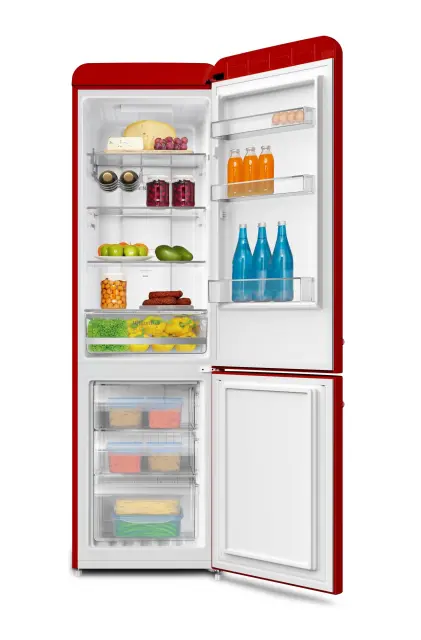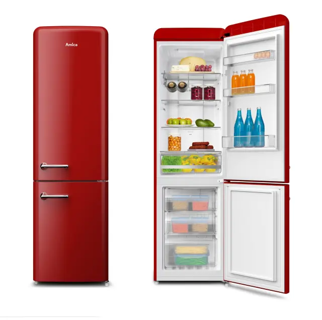 Dvovratni prostostoječi retro hladilnik Amica FK3495.3FRA v rdeči barvi navdušuje s svojo veliko 180 litrsko prostornino hladilnega in 70 litrsko prostornino zamrzovalnega dela. Tehnologija Total Nofrost poskrbi, da vam hladilnika nikdar ne bo treba odtaljevati, medtem ko tehnologija VitControl v predalu za sadje in zelenjavo s svojim popolnim nadzorom vlage zagotavlja ohranjanje svežine živil do 3x dlje. Funkcija Super hlajenja in zamrzovanja omogoča hitro hlajenje in zamrzovanje večje količine živil v kratkem času. Hladilnik se ponaša s štirimi prostornimi policami, predalom za sadje in zelenjavo, nosilcem za dve steklenici, tremi policami na vratih hladilnika, tremi prozornimi predali v zamrzovalnem delu, elektronskim upravljanjem in LED osvetlitvijo, ki omogoča dober pregled nad shranjenimi živili. Kapaciteta zamrzovanja znaša 3,5 kg v 24 urah, vaša shranjena živila bodo ob izpadu električne energije varna še 18 ur, za dodatno varnost pa poskrbi alarm za odprta vrata. Privlačna retro oblika hladilnika se elegantno poda v prav vsako kuhinjo.