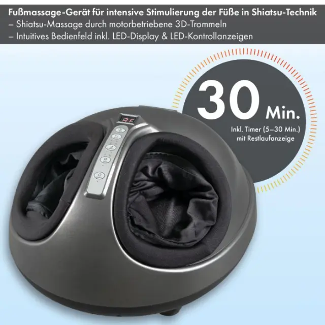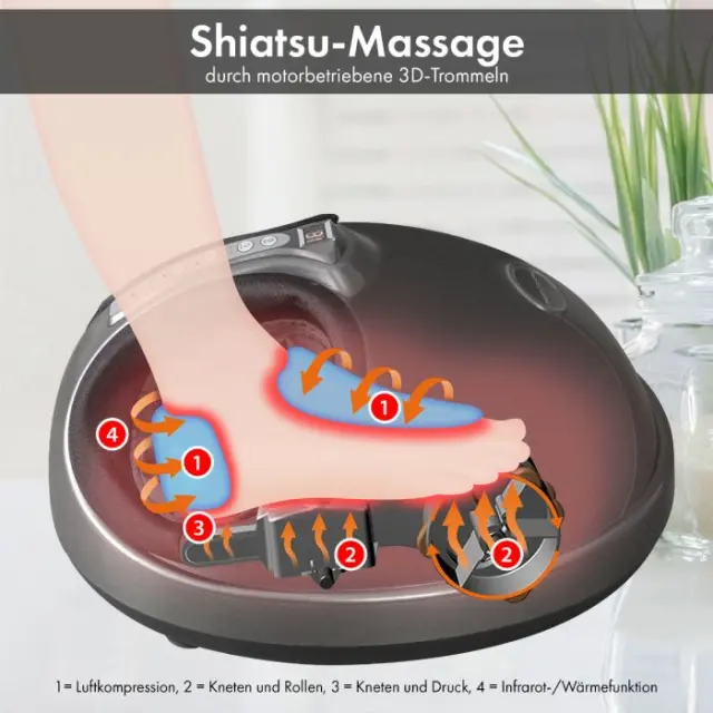 Masažni pripomoček za intenzivno stimulacijo stopal - tehnika shiatsu. Shiatsu masaža je sestavljena iz 3D valjev, ki jih poganja motor. Kombinacija zračnega stiskanja, gnetenja kroglic in uporabe toplote. Masaža spodbuja krvni obtok ter vam pomaga, da se sprostite in udobno regenerirate po napornem dnevu. Naprava je opremljena z infrardečo tehnologijo, ki sprošča mišice v globino. Notranjo prevleko je mogoče prati in je nežna do kože. Masažni aparat je opremljen s 3 programi masaže, 3 stopnjami intenzivnosti, nadzorno ploščo, vključno s prikazovalnikom LED, in indikatorsko lučko LED. Vključuje časovnik (5-30 min) s prikazom preostalega časa. 220-240 V, 50-60 Hz, 40 W