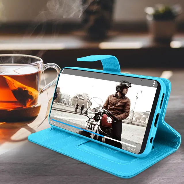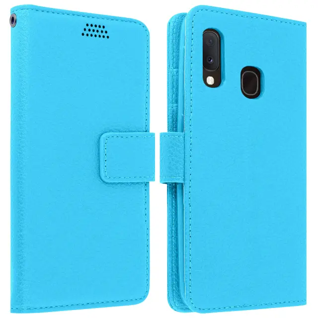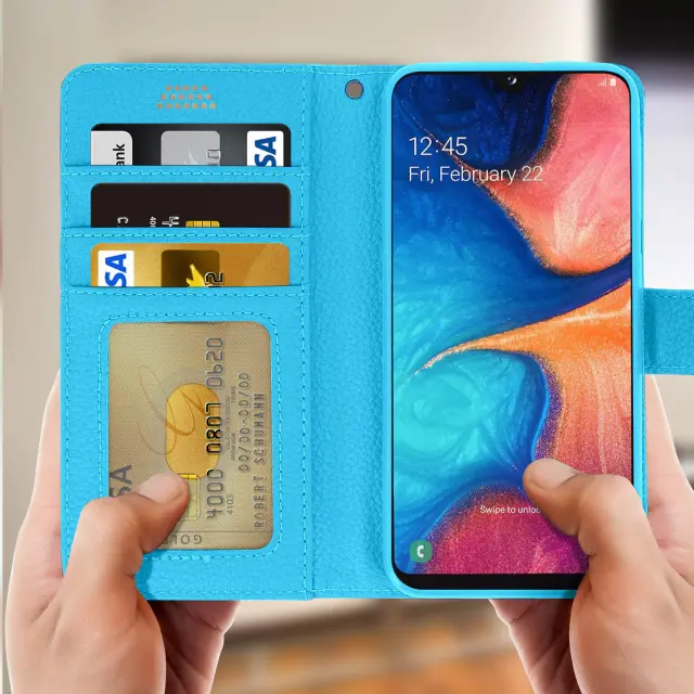Folio Case Držalo za kartice in stojalo za video, zrnat ucinek - modra str. Samsung Galaxy A20e