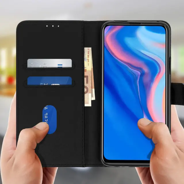 Ovitek Folio Cover, oblikovan za Huawei P Smart Z, Honor 9X, Huawei Y9 Prime 2019. Ovitek iz ekološkega usnja z ponošenim videzom in šivanimi zaključki. Več predelkov za kartice v podlogi z zavihkom. Po meri oblikovana zaščitna prevleka iz silikonskega gela.