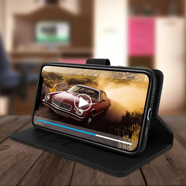 Posebej oblikovana za Apple iPhone 11 Pro Max denarnico. Umirjeno in elegantno oblazinjenje iz eko usnja z ponošenim videzom in šivanimi zaključki. Po meri oblikovana, prilagodljiva in odporna podporna prevleka iz silikonskega gela. Predeli za shranjevanje kartic, vgrajeni v podlogo zavihka.