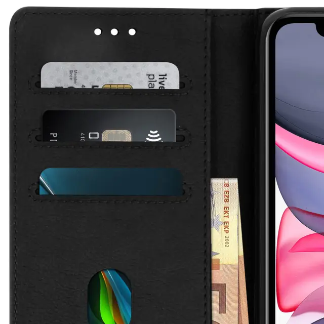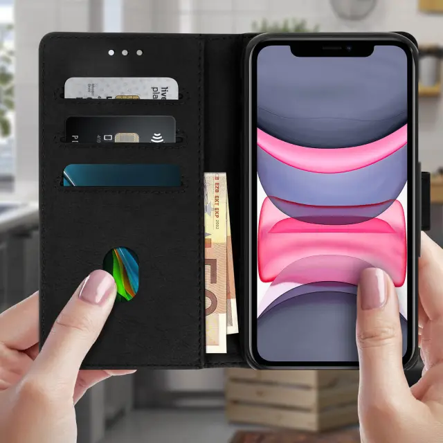 Posebej oblikovana torbica denarnica za Apple iPhone 11. Umirjeno in elegantno oblazinjenje iz eko usnja z ponošenim videzom in šivanimi zaključki. Po meri oblikovana, prilagodljiva in odporna podporna prevleka iz silikonskega gela. Predeli za shranjevanje kartic, vgrajeni v podlogo zavihka.