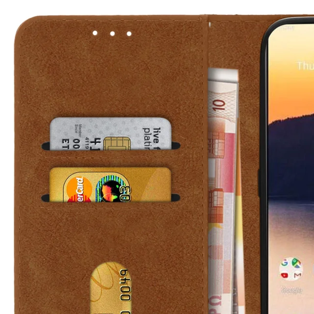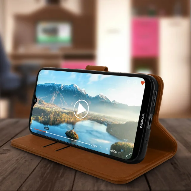 Posebej oblikovana torbica Nokia Wallet Case 2.3. Umirjeno in elegantno oblazinjenje iz eko usnja z ponošenim videzom in šivanimi zaključki. Po meri oblikovana, prilagodljiva in odporna podporna prevleka iz silikonskega gela. Predeli za shranjevanje kartic, vgrajeni v podlogo zavihka.