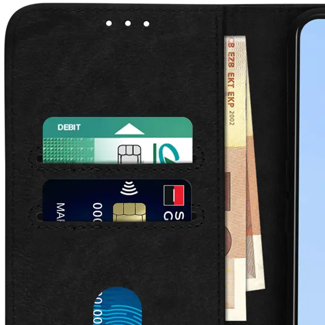 Folio Case z držalom za kartice, posebej zasnovan za Oppo A16 in A16s - črn. Etui z magnetnim zavihkom za zaščito vašega pametnega telefona. Denarnica, integrirana v podlogo zavihka. Vodoravna podporna funkcija za udobno gledanje videoposnetkov.