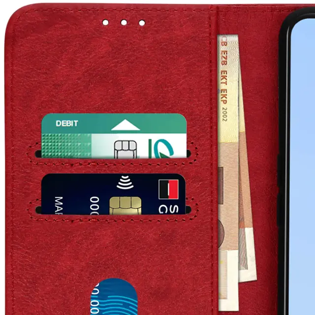 Folio Case z držalom za kartice, posebej oblikovan za Oppo A16 in A16s - rdeč. Etui z magnetnim zavihkom za zaščito vašega pametnega telefona. Denarnica, integrirana v podlogo zavihka. Vodoravna podporna funkcija za udobno gledanje videoposnetkov.