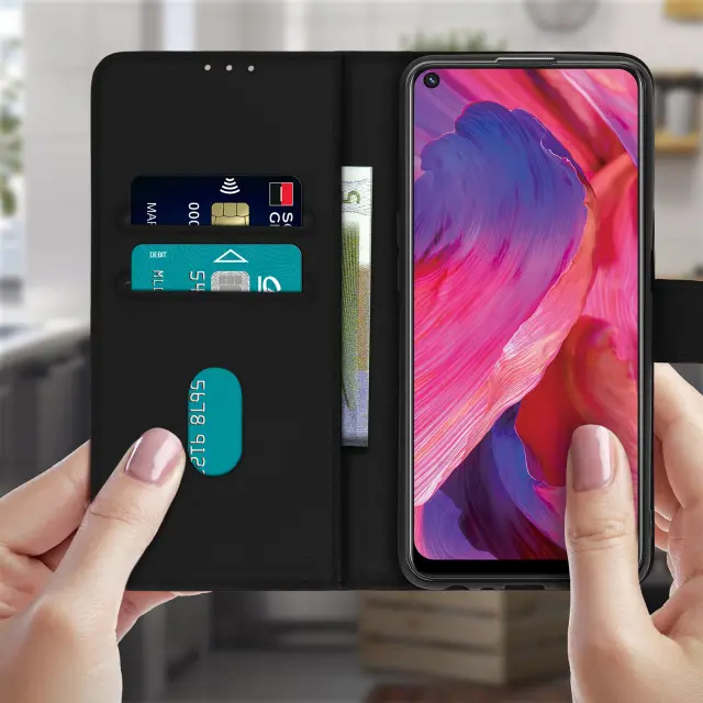 Folio etui za Oppo A74 5G / A54 5G, serija Chesterfield, za zašcito vašega mobilnega telefona pred nepricakovanimi dogodki. Funkcija shranjevanja kartic in video stojala v stranskem žepu. Magnetni jezicek. Dostopne funkcije.