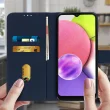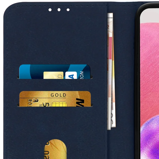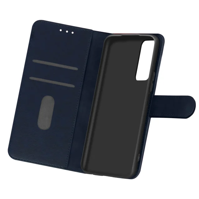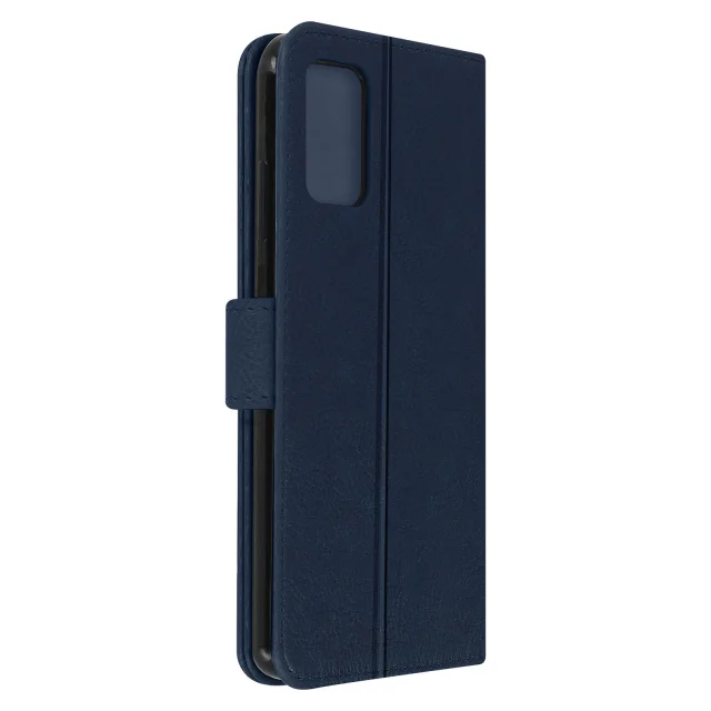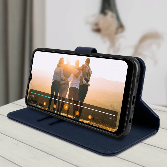 Etui Folio z držalom za kartico, posebej zasnovan za Samsung Galaxy A03s - moder. Etui z magnetnim zavihkom za zaščito vašega pametnega telefona. Denarnica, integrirana v podlogo zavihka. Vodoravna podporna funkcija za udobno gledanje videoposnetkov.