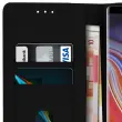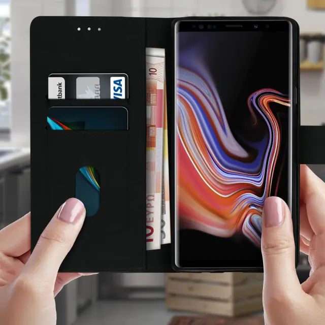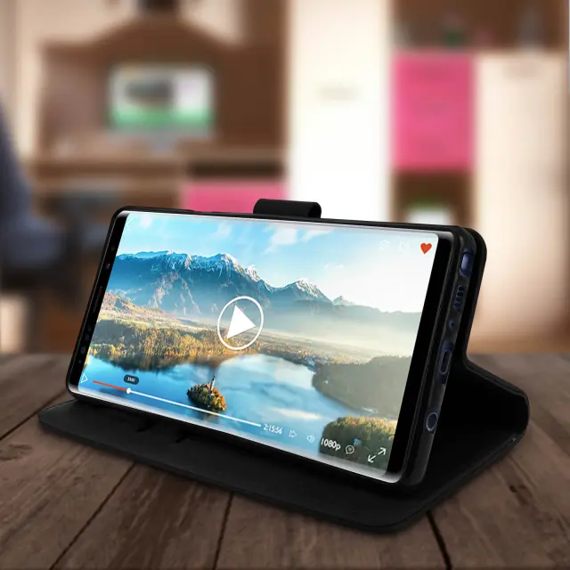 Etui za denarnico, posebej oblikovan za Samsung Galaxy Note 9. Umirjeno in elegantno oblazinjenje iz ekološkega usnja z ponošenim videzom in šivanimi zaključki. Po meri oblikovana, prilagodljiva in odporna podporna prevleka iz silikonskega gela. Predeli za shranjevanje kartic, vgrajeni v podlogo zavihka.
